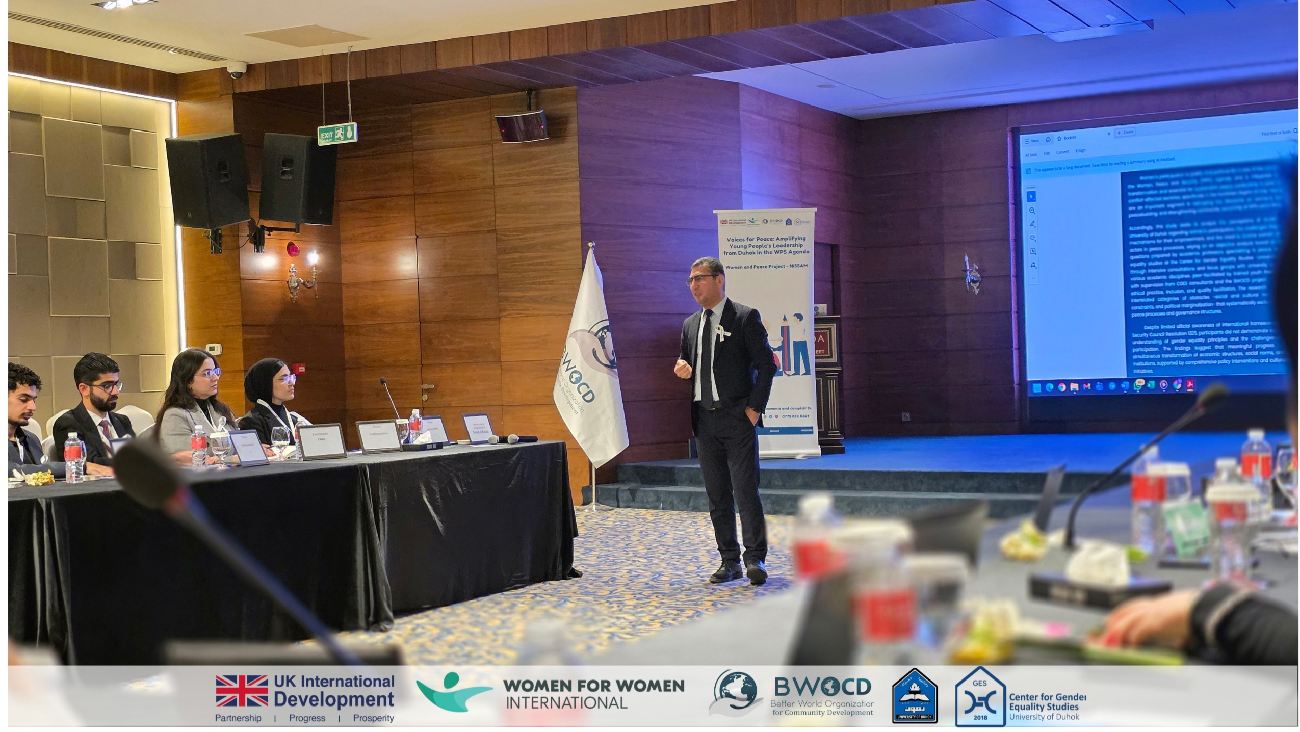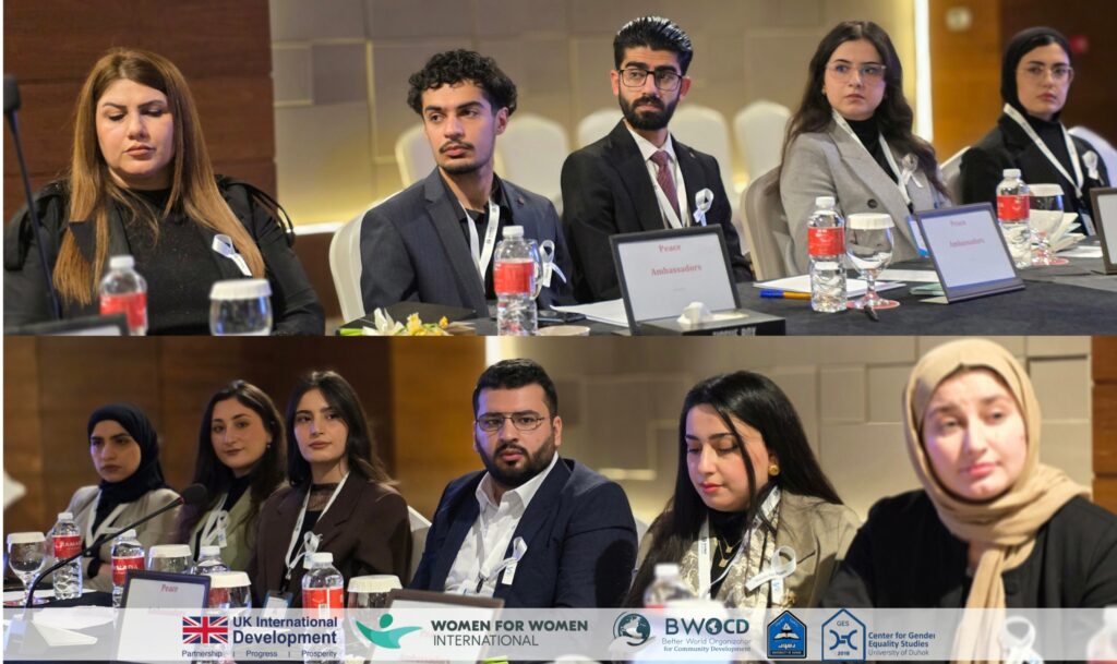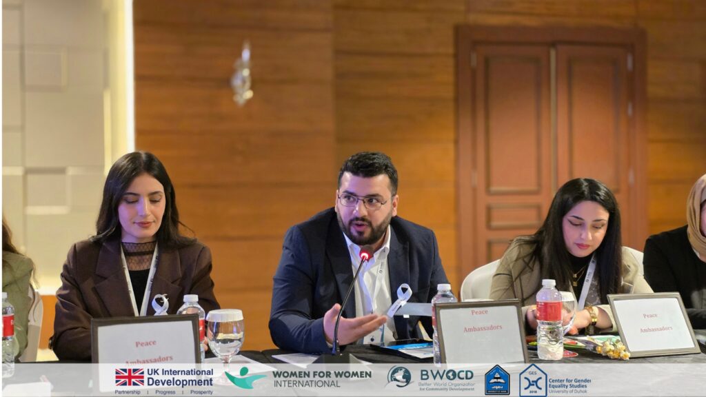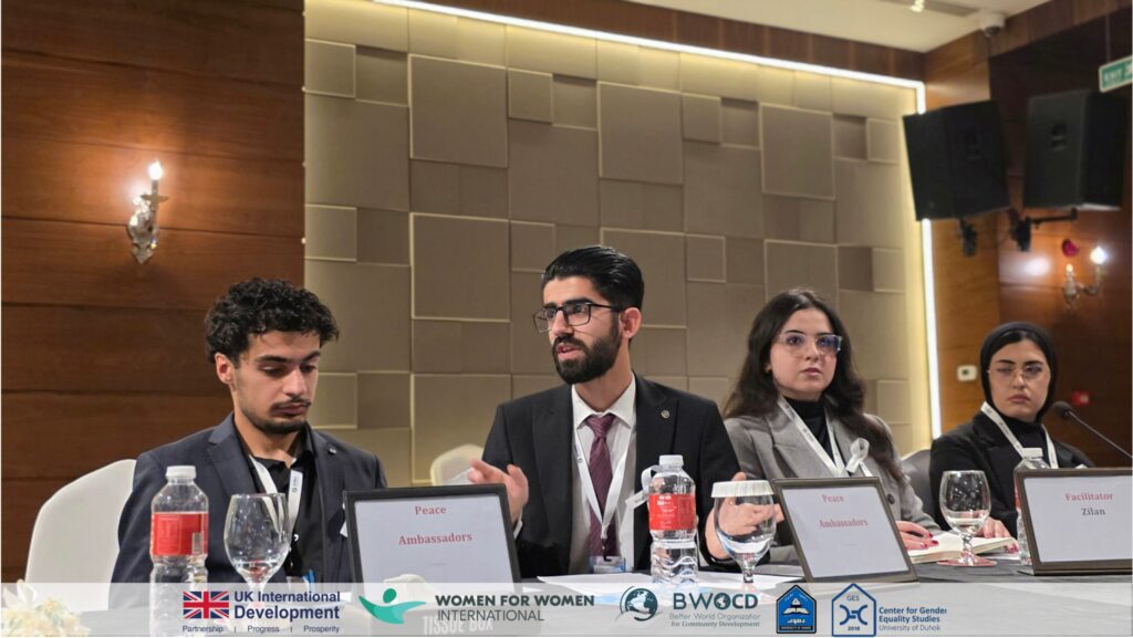 The discussion connected youth with policymakers to explore practical pathways for strengthening women’s participation and advancing the regional implementation of UNSCR 1325. Drawing on insights gathered through the “Voices for Peace” consultation sessions, the Youth Peace Ambassadors presented key recommendations compiled in a booklet developed by consultants from the Center for Gender Equality Studies at the University of Duhok.