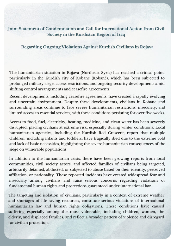 Better World Organization for Community Development (BWOCD), together with a coalition of civil society organizations in the Kurdistan Region of Iraq, has issued a joint statement expressing deep concern over the ongoing humanitarian crisis affecting civilians in Rojava (Northeast Syria), particularly in the city of Kobane.