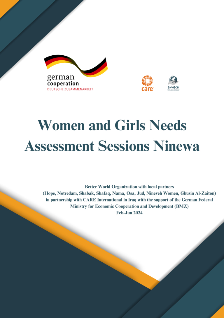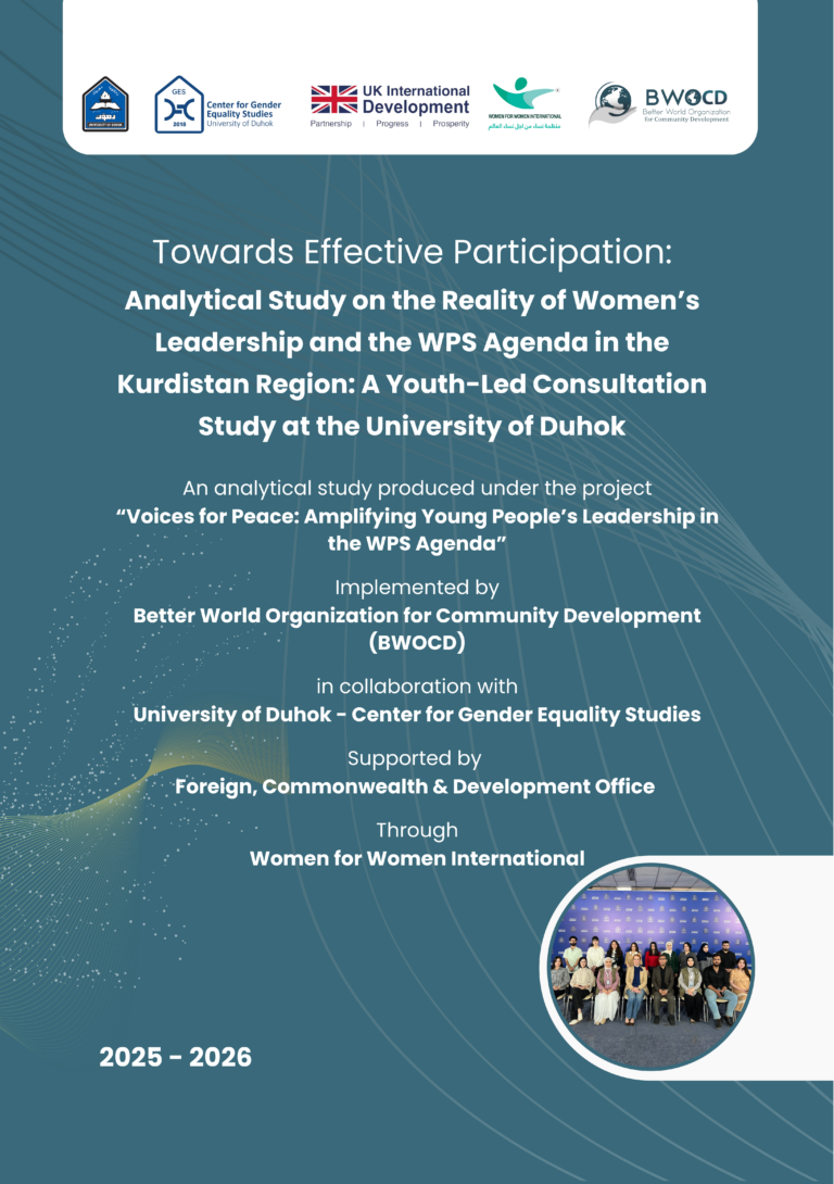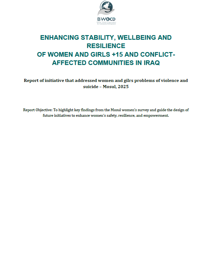 Organization Profile & Impact Publications BWOCD Organizational Profile BWOCD Strategic Framework BWOCD Factsheet 2026 Success Stories Booklet 2024 Success Stories Booklet 2022 Annual Reports Annual Report 2023 Annual Report 2022 Annual Report 2021 Advocacy & Research Women’s Leadership and WPS in the Kurdistan Region: A Youth-Led Study 2026 BWOCD Position Statement on Rojava 2026 BWOCD Enhancing Stability and Wellbeing of Women and Girls in Conflict-Affected Communities – Mosul Initiative Report (2025) BWOCD Assessment Report on Women and Girls Needs in Ninewa Governorate 2024 Joint Statement on the Occasion of 5 Years Since the Enactment of the Yazidi Survivors Law in Iraq 10 Demands, 10 Years After the Genocide by ISIL Educational Resources & Practical Guides Digital Gender-Based Violence: Risks, Impacts, and Prevention Strategies Family Counseling Practitioner Guide Climate Change Awareness Guide Child Neglect Awareness Guide Domestic Violence Awareness Guide Bullying Prevention Guide Sexual Abuse Awareness Guide Positive Parenting and Family Strengthening Guide Internet Safety Awareness Guide